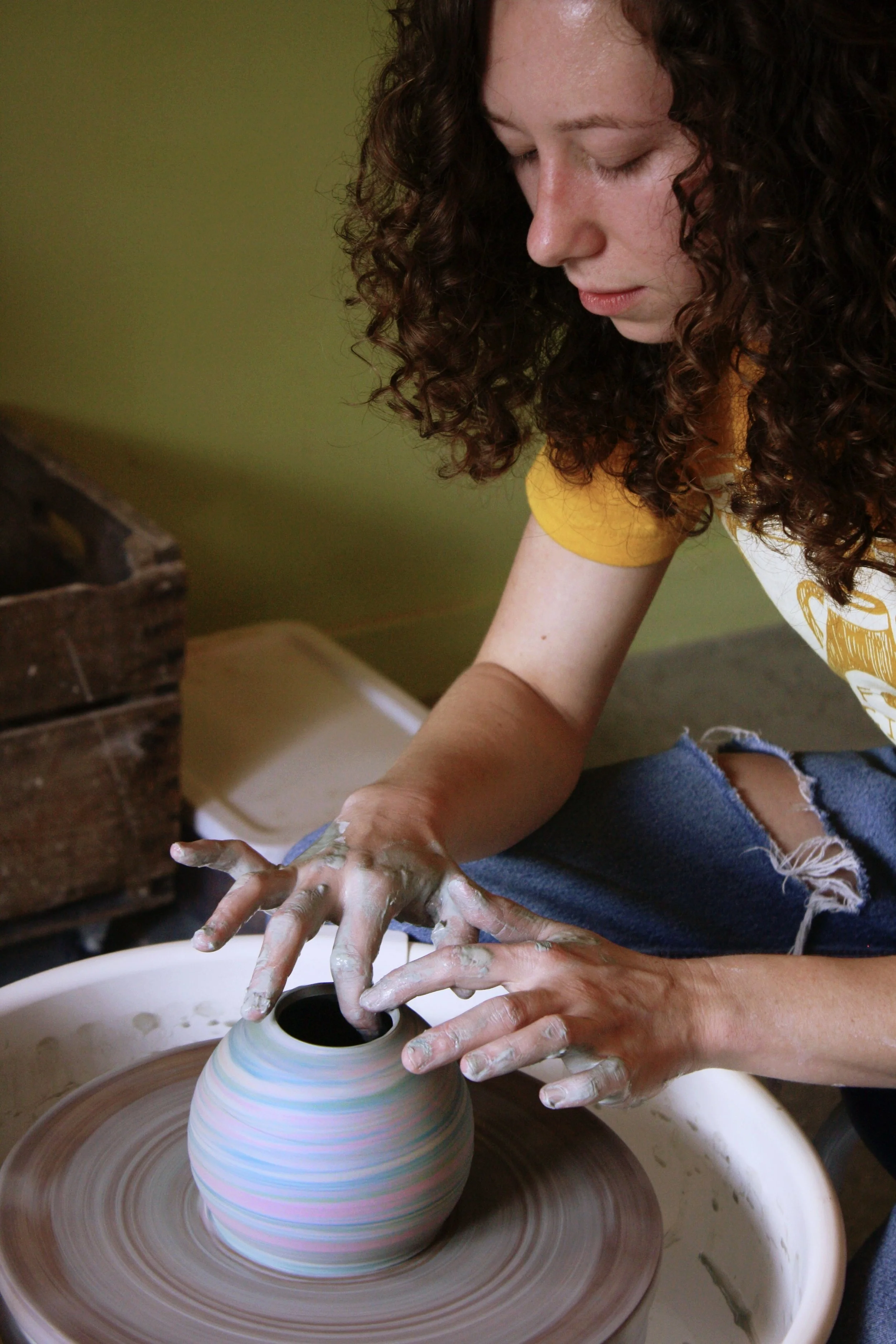 This will be an intermediate level wheel throwing workshop- Experience is required! You must be able to throw a basic vessel on the wheel. You may create a vessel of your choosing- Cup, vase, planter, etc. In this workshop you will learn how to use mason stains to make colored clay and then use that clay to make a marbled vessel- aka Agateware- on the wheel! This will be a small group, two day workshop. Day one will focus on making colored clay and throwing with it. Day two will be trimming and carving your piece- This stage is when the colors and patterns will really stand out! Your piece will then be fired and clear glazed by us. It will be ready to pick up roughly 4-5 weeks after the workshop, to allow proper time for drying.