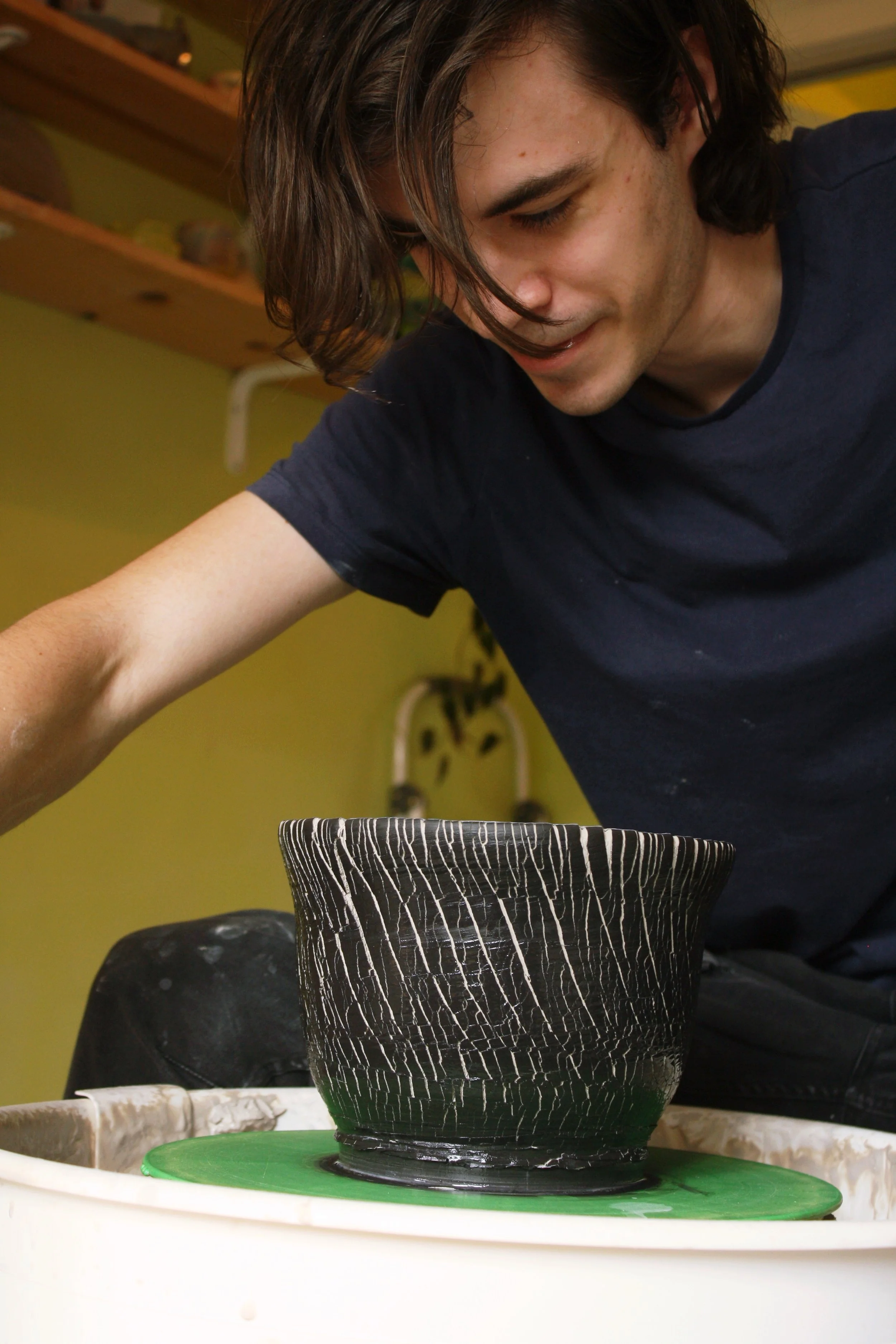 This will be an intermediate level wheel throwing workshop- Experience is required! You must be able to throw a basic vessel on the wheel. You may create a vessel of your choosing- Cup, vase, planter, etc. In this workshop you will learn how to use underglaze in combination with a a sodium silicate wash to create a unique, textured surface on your vessel.