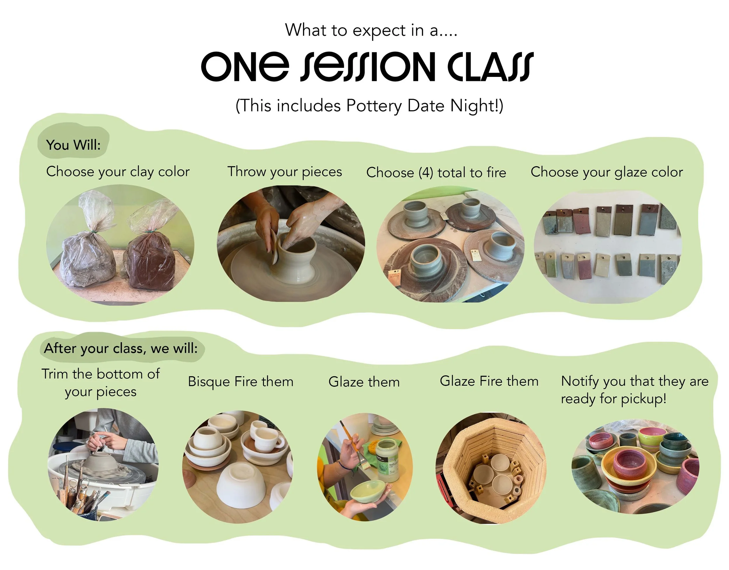 Choose a preference of brown or white clay when you arrive at the studio- But be warned, we will be getting dirty and the brown clay might stain light colored clothing. Aprons will be available, however if you want to wear something nice you might want to choose white clay.